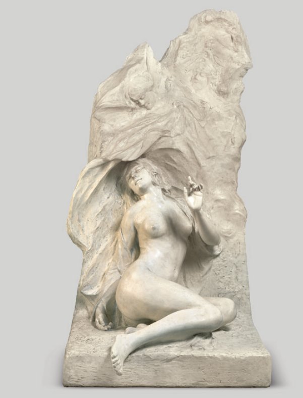 nos muestra una escultura con una mujer sobre una roca, pareciera que se ha caído después de varias copas.